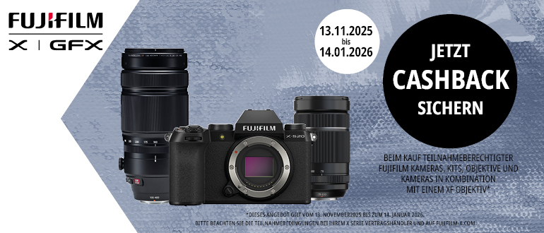 Kunden, die eine teilnahmeberechtigte FUJIFILM Kamera, ein teilnahmeberechtigtes FUJIFILM Kit, ein teilnahmeberechtigtes FUJINON XF Objektiv oder eine teilnahmeberechtigte FUJIFILM Kamera in Kombination mit einem teilnahmeberechtigten FUJINON XF Objektiv („Teilnahmeberechtigte Produkte“) im Aktionszeitraum 13. November 2025 bis 14. Januar 2026 erwerben, können eine Cashback-Auszahlung beantragen.