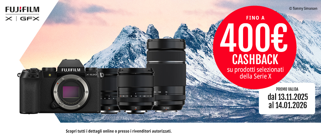I clienti che acquistano una nuova fotocamera o una nuova ottica FUJIFILM in promozione (“Prodotti in promozione”) tra il 13 novembre 2025 e il 14 gennaio 2026 (“Periodo promozionale”) potranno richiedere un rimborso.