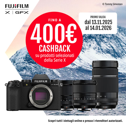 Le fotocamere e le ottiche FUJIFILM di seconda mano o rigenerate sono escluse dalla promozione. L'importo del rimborso varia in base ai prodotti in promozione acquistati. I prodotti in promozione, i rimborsi e i periodi promozionali sono illustrati nella pagina “Maggiori informazioni”.
