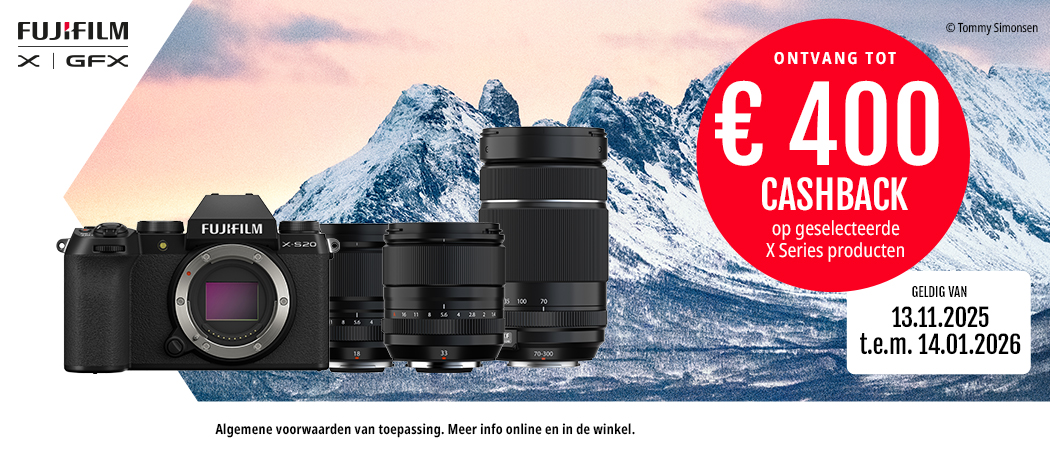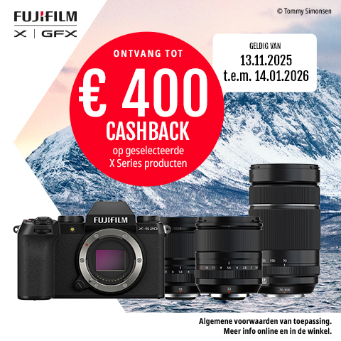 Klanten die tussen 13 november 2025 en 14 januari 2026 ('promotieperiode') een NIEUW in aanmerking komend FUJIFILM X Series Product ('in aanmerking komende producten') aanschaffen, komen in aanmerking voor de promotie. Tweedehands of gereviseerde FUJIFILM-producten zijn uitgesloten van deze promotie.